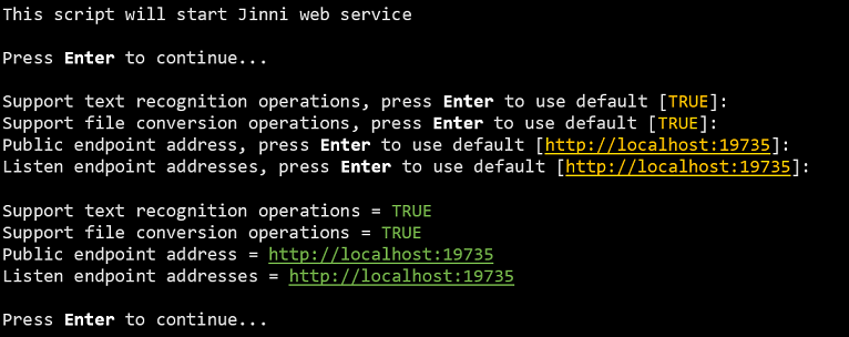 Если веб-сервис запускается с помощью исполняемого файла, то для изменения прослушиваемой конечной точки укажите необходимое значение для переменной JINNI_LISTEN при запуске скрипта start.bat, который находится рядом с запускаемым исполняемым файлом Jinni.exe.