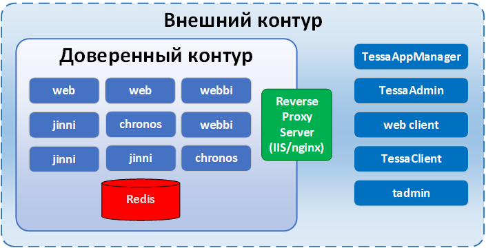 Все из вышеперечисленных компонентов работают в доверенном контуре. Помимо них, в доверенный контур также входят СУБД Microsoft SQL Server или PostgreSQL, Redis (является обязательным ресурсом), разделяемые сетевые файловые директории и соответствующий reverse proxy, в роли которого может выступать IIS или nginx.