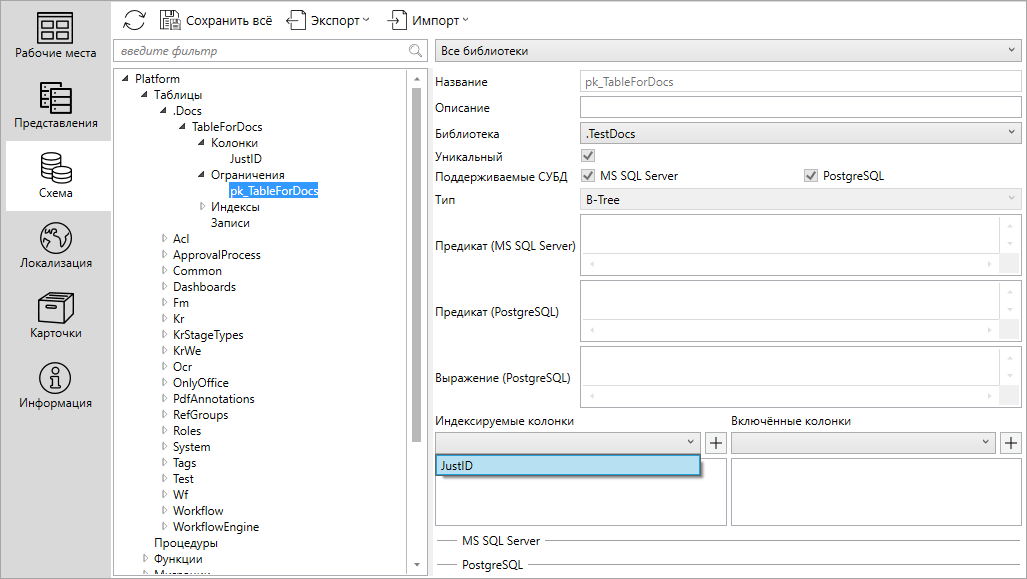 Чтобы задать ключевое поле, в разделе Индексируемые колонки из выпадающего списка нужно выбрать требуемое поле и далее нажать на кнопку +.