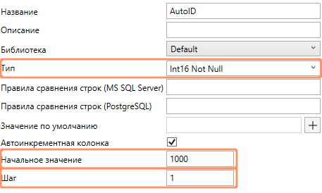 Данная настройка позволяет создавать автоинкрементные колонки, значения для которых определяются СУБД автоматически. Для этого в свойствах физической колонки нужно отметить флаг Автоинкрементная колонка, задать целочисленный Not Null Тип и выбрать Начальное значение и Шаг, с которым выделяются следующие значения. Если в настройках колонки эти значения не заданы, то используются значения по умолчанию (1 для начального значения и 1 для шага). Отрицательные значения шага позволяют сделать убывающий список.