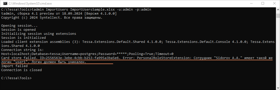 Логин сотрудника должен быть уникален. Если в файле встретится повторяющийся логин или сотрудник с таким логином уже есть в TESSA, то в консоль будет выведена ошибка: