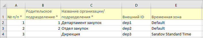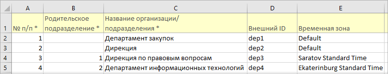 Для подразделения обязательные поля: “№ п/п”, “Родительское подразделение” (если подразделение корневое, то данное поле оставить пустым), “Название организации/подразделения”.