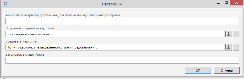 Заголовок вкладки/окна - определяет заголовок для открываемой вкладки или модального окна, в зависимости от варианта открытия созданной карточки. Если значение не указано, то используется стандартный текст заголовка.
