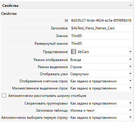 При помощи окна свойств настроить представление. В данном случае для примера используется “AbCars”.