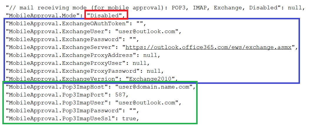 Для настройки получения сервисом ответных писем мобильного согласования необходимо сначала указать режим MobileApproval.Mode - "Exchange", "IMAP" или "POP3", и далее указать настройки в соответствии с выбранным режимом.