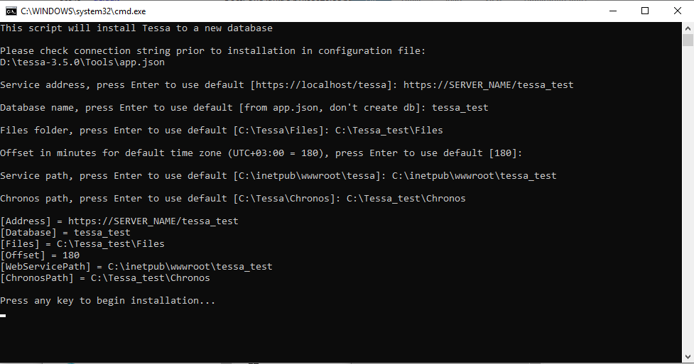 tessa_test, при этом в консоли необходимо указать адрес подключения к тестовому серверу, имя тестовой БД и папки с файлами: