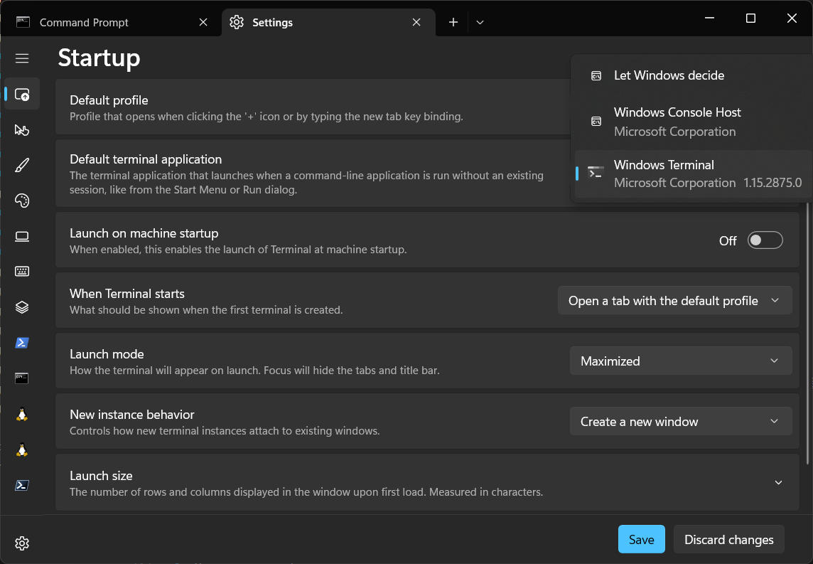 - Откройте Windows Terminal, откройте настройки Settings, выберите слева вкладку профиля “Командная строка” (Command Prompt).