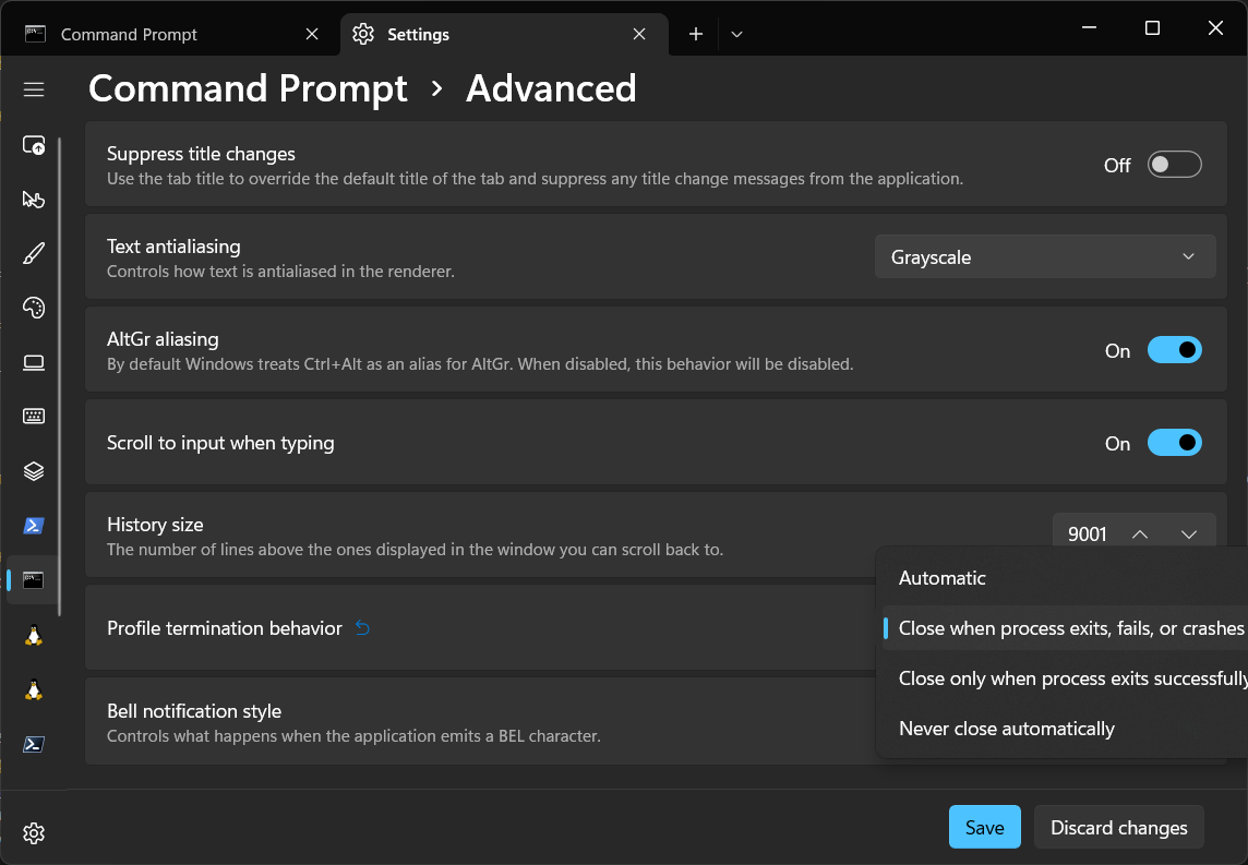 - Выберите поле с поведением при закрытии приложения “Profile termination behavior” как закрытие при любом завершении процесса “Close when process exits, fails, or crashes”.