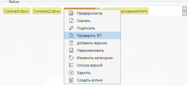 После выполнения указанных выше настроек в web-клиенте в карточке документа для приложенных файлов появится пункт меню “Подписать”: