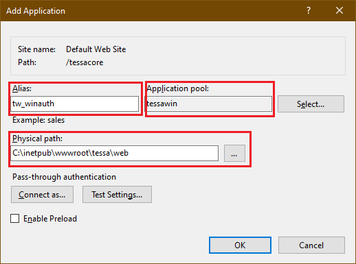 В IIS создать пул приложений (в этом примере с именем “tessawin”) с параметрами, аналогичными основному пулу приложений (указать “Без управляемого кода” в выпадающем списке)