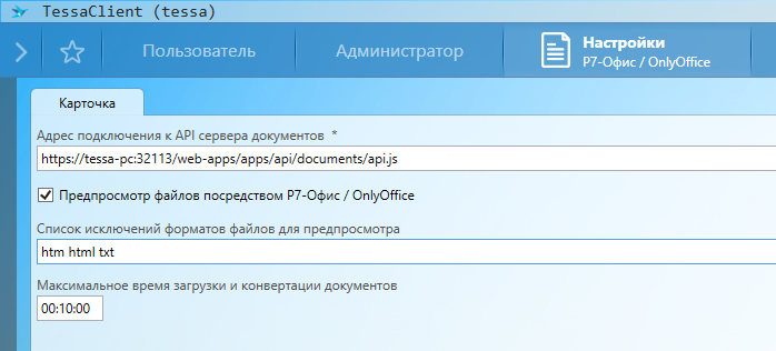 Для просмотра, предпросмотра и редактирования документов может использоваться Р7-Офис / OnlyOffice. Он устанавливается на сервер приложений, либо на отдельный сервер. Для установки нужно воспользоваться Инструкцией по установке. Затем в карточке настроек Р7-Офис / OnlyOffice указать адрес подключения к api сервера документов.