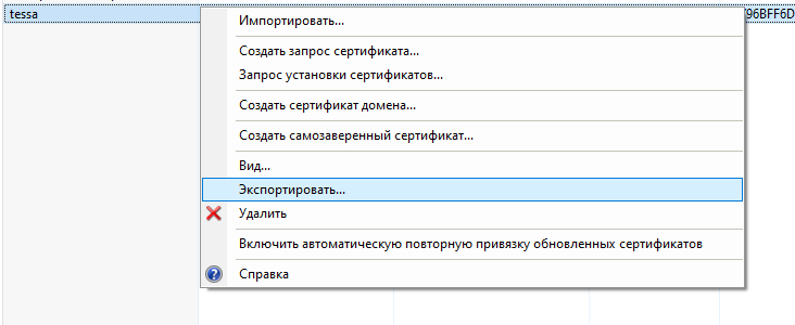 Для примера экспортируем самоподписанный сертификат для нашего сервера с именем tessa-pc (укажем любой пароль). В IIS это можно сделать в разделе “Сертификаты сервера”. Укажите имя файла tessa.pfx или замените его в командах ниже.
