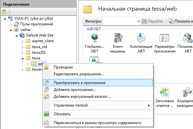 Default Web Siteи вложенная в него папкаtessa\web. Папку необходимо преобразовать в приложение через контекстное меню и указать в настройках созданный ранее пул приложений (для примера -tessa):