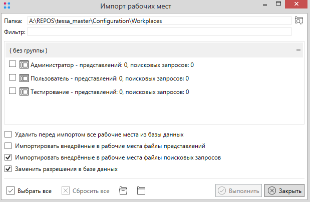 Теперь необходимо импортировать рабочие места. Сделать это можно, перейдя во вкладку Рабочие места и нажав кнопку Импорт. В появившемся окне нужно указать путь до папки из сборки Configuration\Workplaces. После - нажать кнопку Выбрать все и установить флажки Заменить разрешения в базе данных и Импортировать внедрённые в рабочие места файлы поисковых запросов, затем нажать кнопку Выполнить.