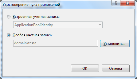 Выбрать Особая учетная запись, нажав на кнопку Установить… откроется окно, где необходимо указать учетную запись (в формате имя домена\имя учетной записи и пароль):
