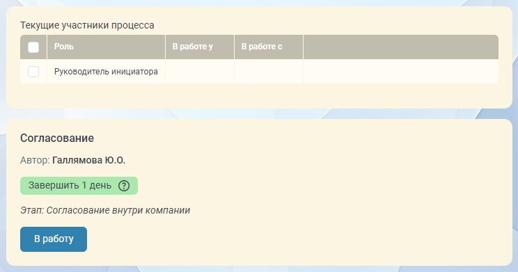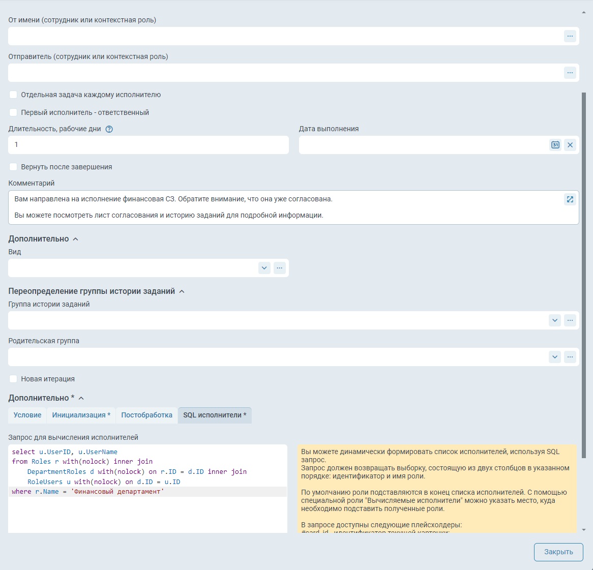 - Роль соответствует одному из значений: владельцу текущего процесса, если он задан, иначе инициатору текущего процесса, если он задан, иначе текущему сотруднику.