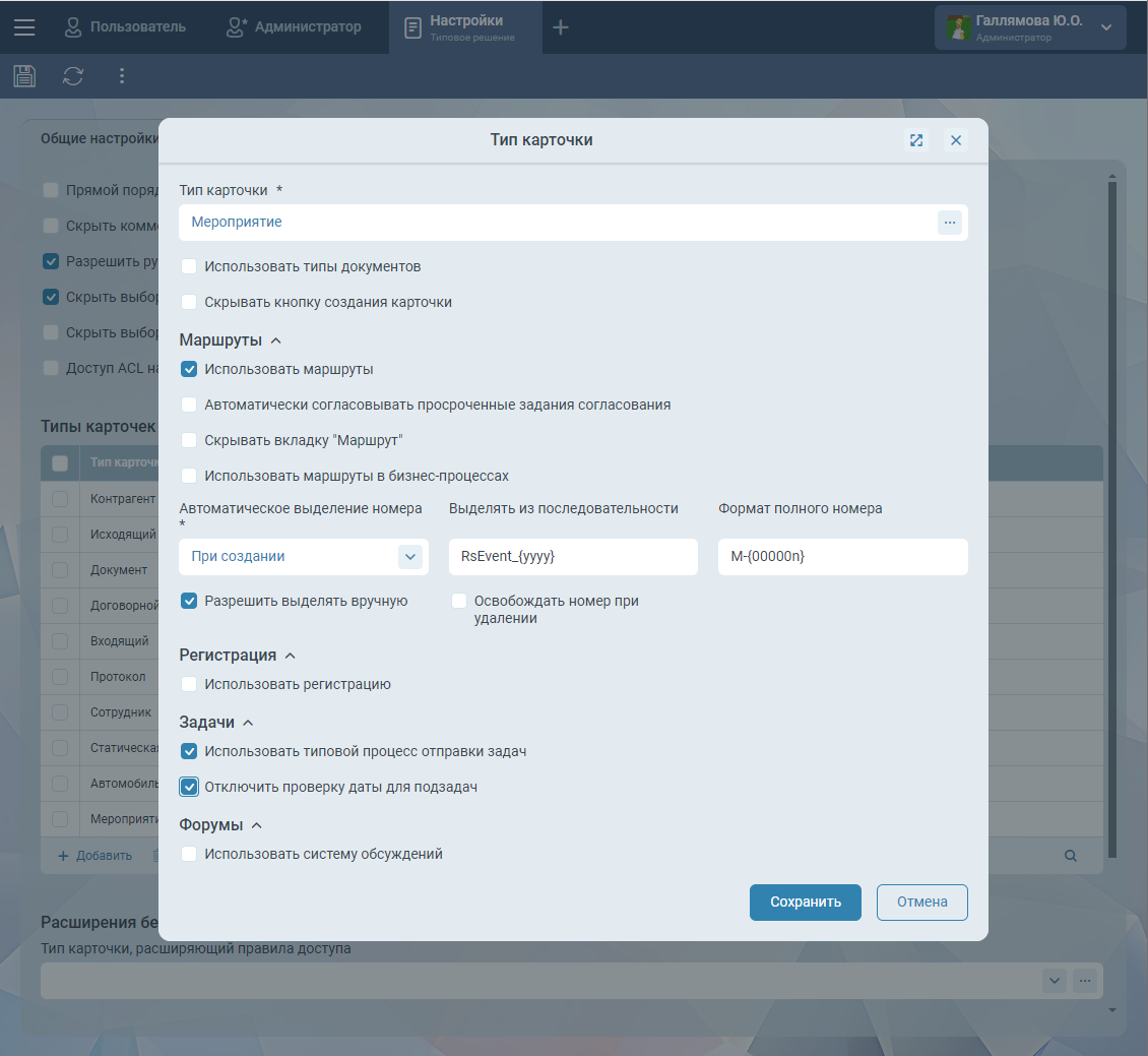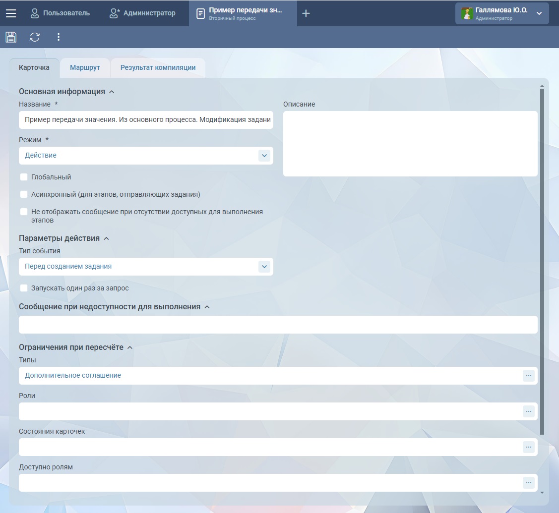 - С помощью подсистемы маршрутов есть возможность выполнять различные действия или проверки при сохранении карточки, выполнении задания и т.п.