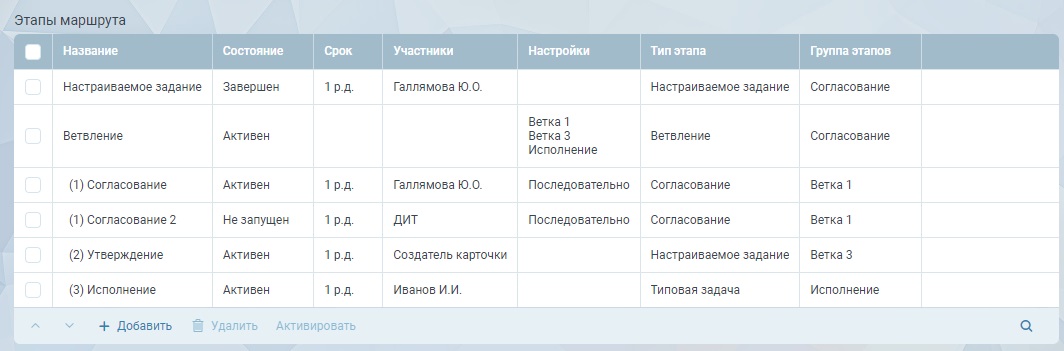 - выполняются условия включения в маршрут этих шаблонов этапов. У подтвержденных шаблонов, этапы которых останутся в маршруте (условие истинно), устанавливается флаг