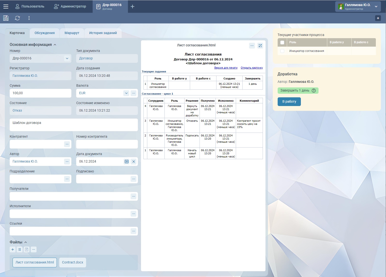 В базовой поставке платформы маршрут настроен таким образом, что при несогласовании документа выполняется возврат в начало маршрута на этап “Доработка”. В данном случае возврат на доработку является частным случаем “входа” в группу и поэтому перед формированием задания доработки будет выполнен пересчет маршрута.