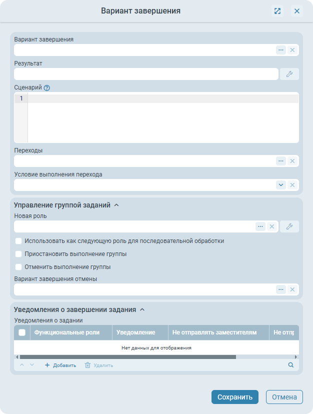 - Вариант завершения (значение из списка вариантов завершения, может быть привязано к параметрам процесса) - определяет вариант завершения, с которым будет завершено задание. Доступно только при типе управления Завершить задание.