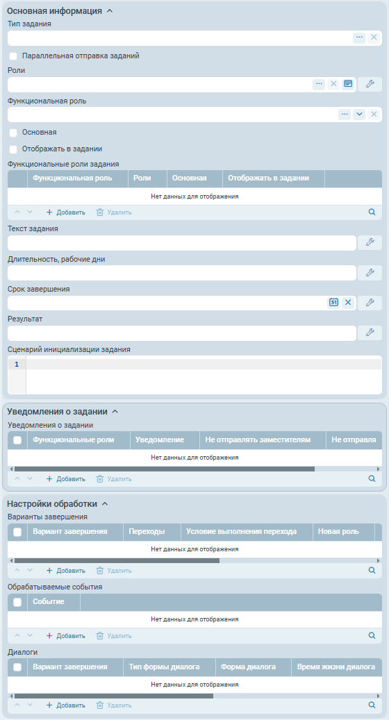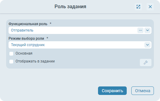 Если, согласно настройкам, ролей должно быть несколько, и установлен флаг Основная, то основной выбирается первая роль из списка.- Отображать в задании - записи в связанных с заданием ролях, которые будут получены на основе данной строки, должны отображаться на панели задания. Может быть привязано к параметрам процесса.