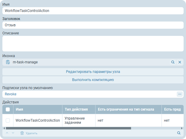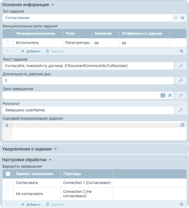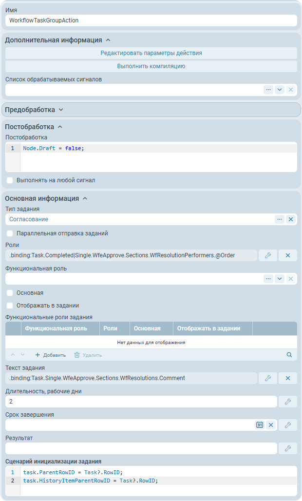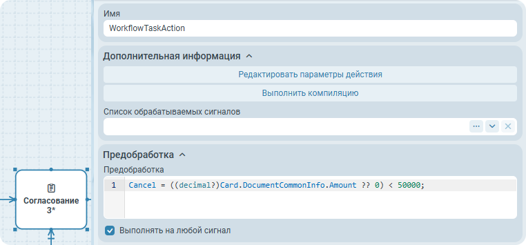 Действие узла Согласование, WorkflowTaskAction, настраивается следующим образом: