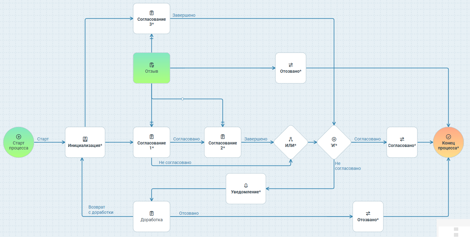 Это пример поэтапного создания процесса со своими настройками, где используется стандартное действие Задание. Однако для заданий согласования и доработки удобно использовать соответствующие действия из группы Маршруты, т.к. в них уже заложено много функциональности, например, запрос дополнительного согласования, делегирование и т.п.