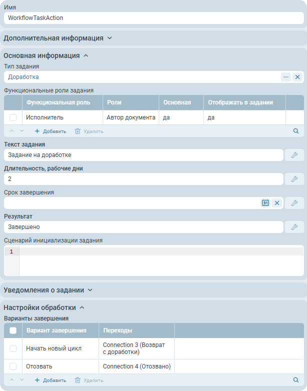 Действие узла Доработка, WorkflowTaskAction, настраивается таким образом: