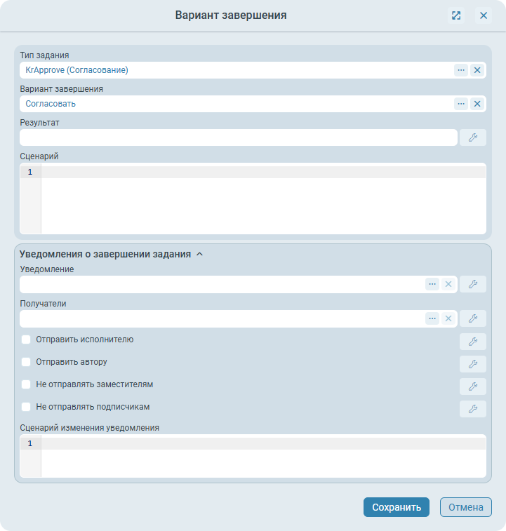 KrApprove). Для задания результата других типов заданий следует использовать поле Результат, расположенное в настройках обработки заданий, при их завершении по вариантам завершения (см. Варианты завершения).