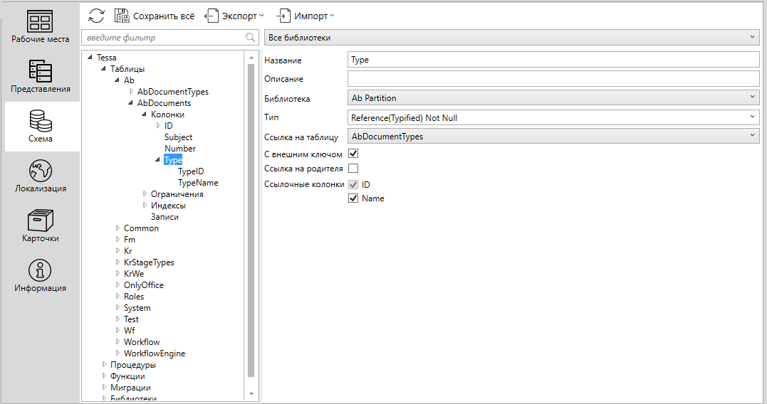 AbDocumentTypesв поле Ссылка на таблицу, т.е. указать, что колонка Type содержит ссылку на таблицуAbDocumentTypes. Первичным ключом этой таблицы является колонкаID, поэтому в узел колонки “Type” была автоматически добавлена колонка “TypeID”. Физически в БД для таблицы будет создана именно колонка TypeID, в то время как колонкаTypeопределена в метаинформации схемы данных для использования в платформе.Example