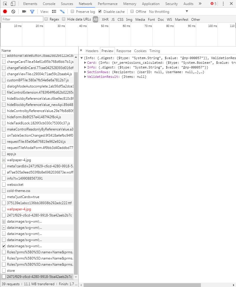 На вкладке “Network” выводятся все запросы к серверу. При нажатии на запрос будут выводиться данные ответа.