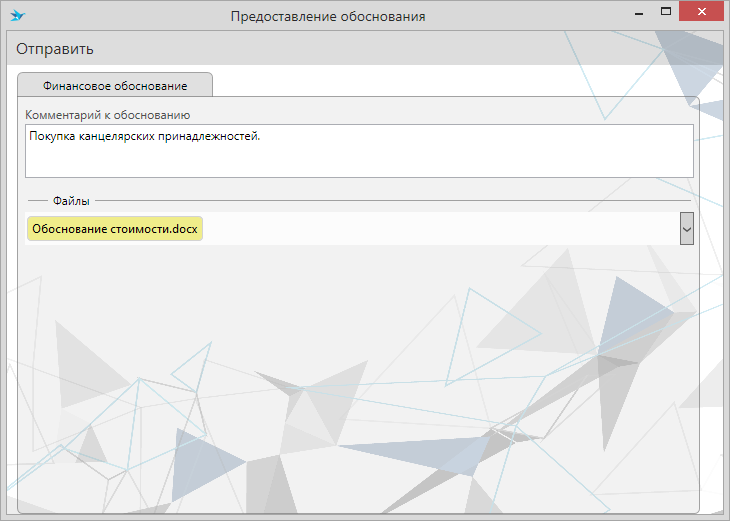 Для примера, система настроена таким образом, что приложенные в диалоге “Предоставление обоснования” файлы прикладываются в карточку документа и введённый комментарий к финансовому обоснованию записывается в поле “Комментарий к обоснованию”:
