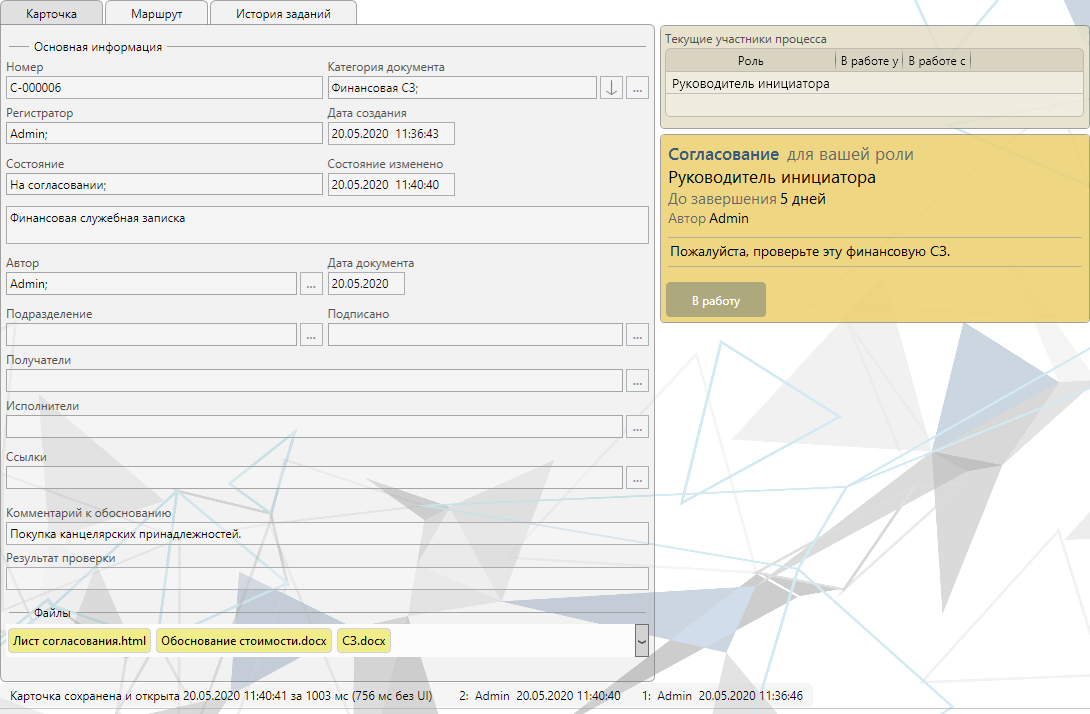 Теперь давайте согласуем документ. Нажмите “В работу”, затем “Согласовать” и еще раз “Согласовать” в форме завершения. Система сразу же отправляет следующее задание согласования на роль “Финансовый департамент” (и это опять мы - для удобства).