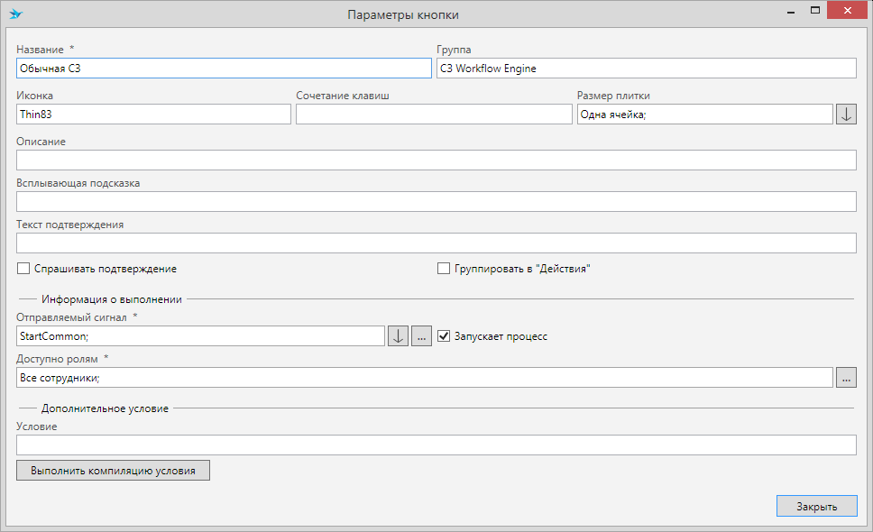 Добавьте кнопку бизнес-процесса “Обычная СЗ” и настройте её как показано на рисунке: