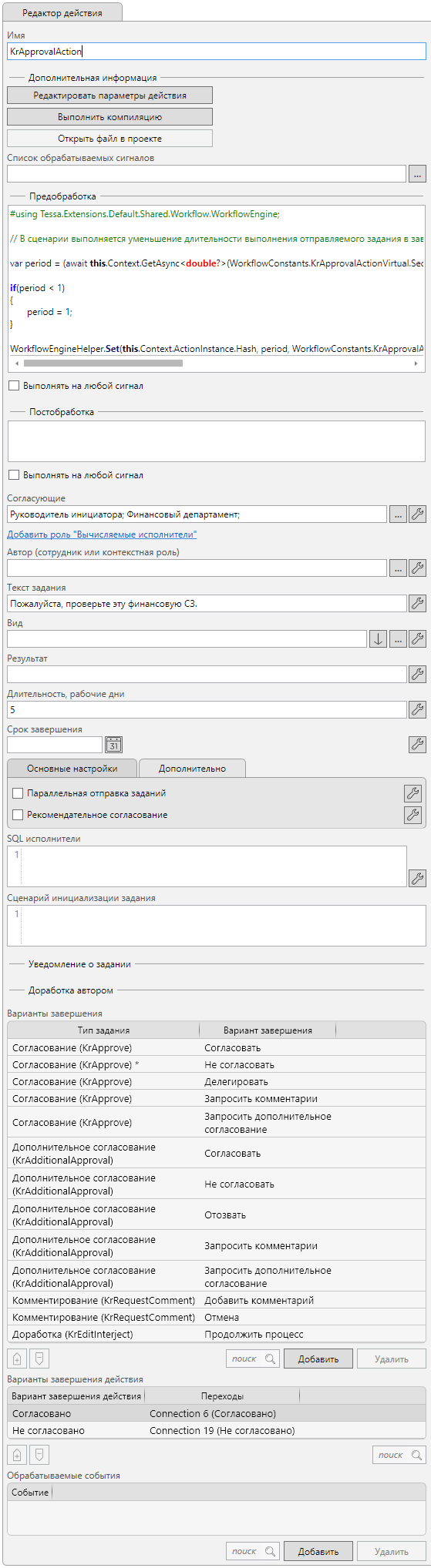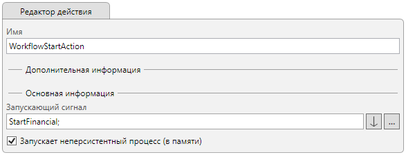 Для реализации возможности создания служебных записок двух разных категорий “Финансовая СЗ” и “Обычная СЗ” процесс содержит два действия “Старт процесса”, каждый из которых настроен на обработку своего сигнала. Так действие из узла “Старт процесса по финансовой СЗ” обрабатывает сигнал “StartFinancial”, а из “Старт процесса по обычной СЗ” - “StartCommon”.