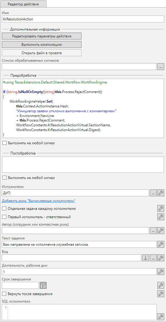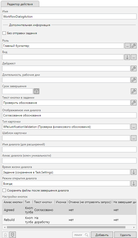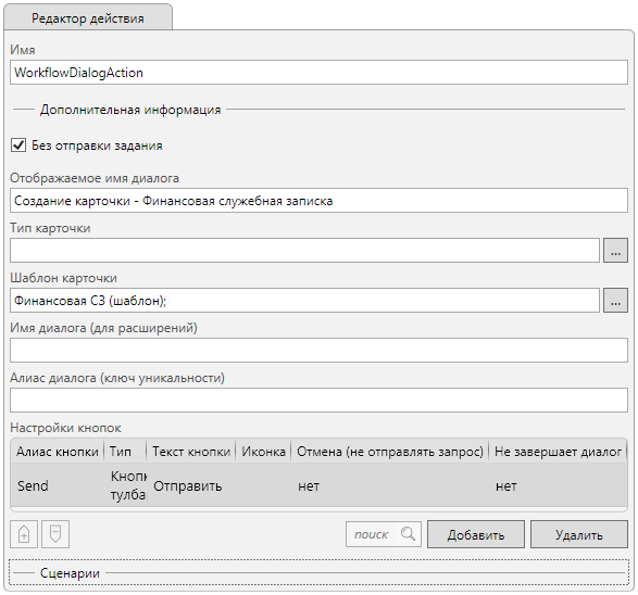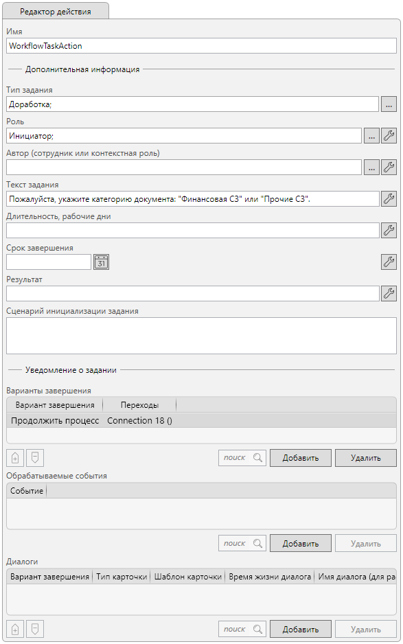 Для реализации создания карточки по шаблону и открытию её в диалоговом окне используется действие “Диалог” расположенное в узлах “Инициализация финансовой СЗ” и “Инициализация обычной СЗ”.