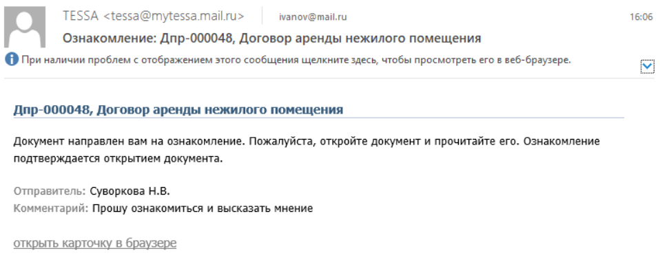 При отправке документа на ознакомление сотруднику на почту приходит уведомление. После нажатия на ссылку в письме откроется карточка документа.