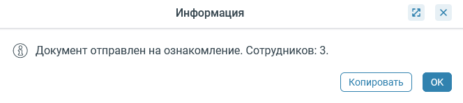 После нажатия на кнопку ОК всем указанным сотрудникам, а также всем сотрудникам, входящим в указанные роли, и их заместителям на почту будут отправлены уведомления о необходимости ознакомиться с документом. Система выдаст сообщение с информацией, что уведомления отправлены.