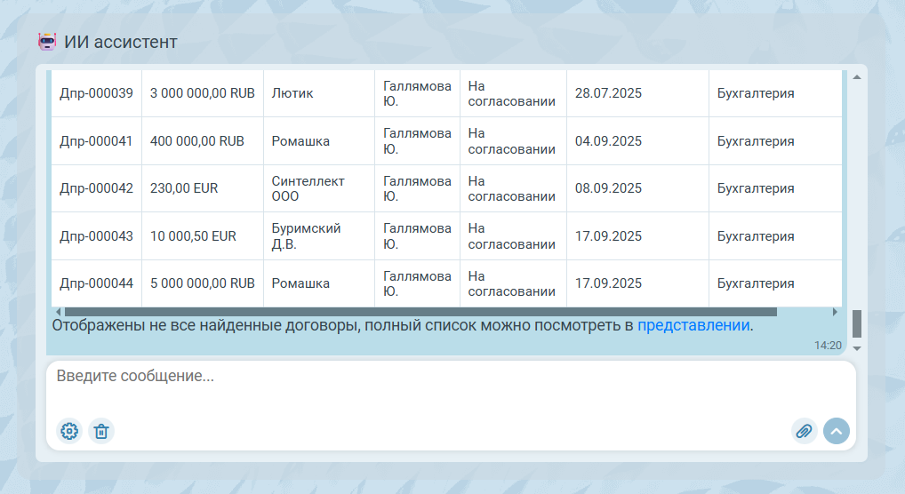Каждая из строк таблицы в ответном сообщении ассистента является кликабельной, двойным кликом по ней можно перейти в карточку договора.