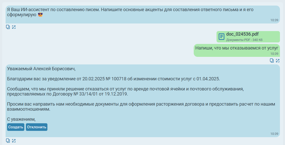 ИИ ассистентом будет предложен текст ответного исходящего документа с использованием необходимой информации из входящего документа (ФИО получателя, дата получения входящего документа, упомянутые в нём даты, номера и пункты договоров и т.д.) и в соответствии с нормами официально-делового стиля. При необходимости можно cкорректировать предложенный текст, отправив соответствующий запрос, например, “Поменяй стиль письма на более строгий/дружеский”, “Добавь благодарность за годы сотрудничества с компанией” и т.д.