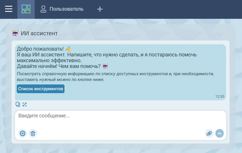 По кнопке Список инструментов открывается всплывающее окно, содержащее список всех доступных ИИ ассистенту действий в системе.