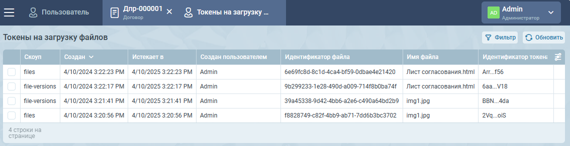 Откроется соответствующее представление, в котором пользователь увидит все выданные им токены доступа, а администратор системы - токены доступа, выданные всеми пользователями для данной карточки.