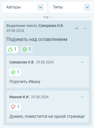 На любые аннотации и комментарии можно ставить реакции. Для этого нужно нажать на три точки в правом верхнем углу комментария или аннотации и выбрать нужную реакцию. Справа от реакции отображается количество сотрудников, ее поставивших. Чтобы посмотреть, кем поставлена реакция, нужно навести на неё курсор.