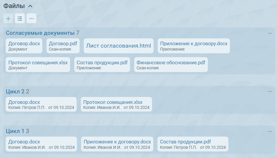 По циклу согласования - группировка по циклам согласования документов. Позволяет отобразить список файлов в следующем виде: