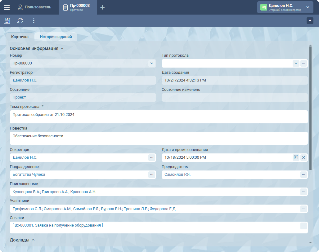 Для сохранения карточки достаточно заполнить Тему протокола, однако рекомендуется указать значение и в остальных полях: