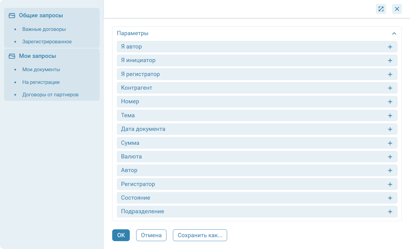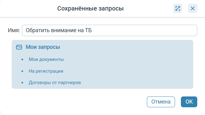 Все сохраненные пользователем запросы отображаются в разделе Мои запросы и доступны только текущему пользователю. Общие запросы - запросы, доступные всем сотрудникам системы, создаются Администраторами.