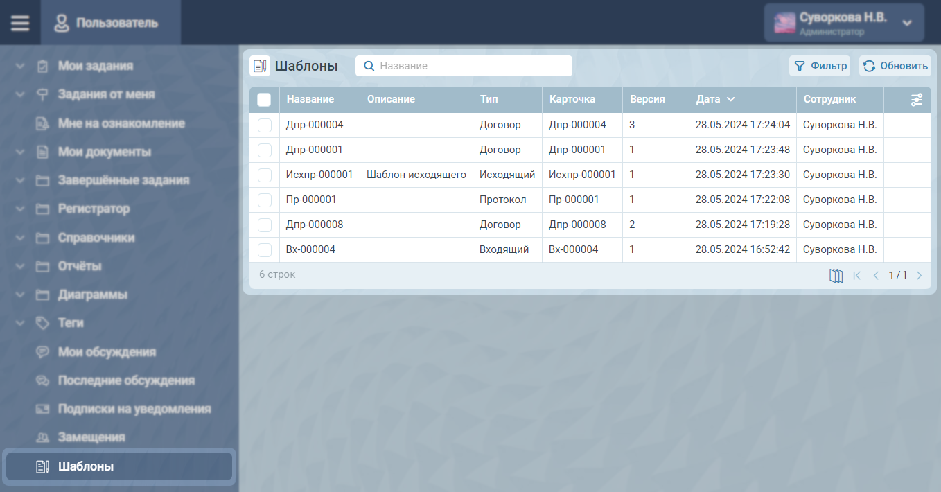В системе имеется возможность создания шаблонов для карточек разных типов. Шаблоны используются при необходимости создавать большое количество однотипных карточек с заранее заполненным набором полей. Все заполненные данные, такие как значения полей, маршруты и файлы, будут переноситься в карточку документа, созданному по данному шаблону. Шаблоны можно создать следующим образом: