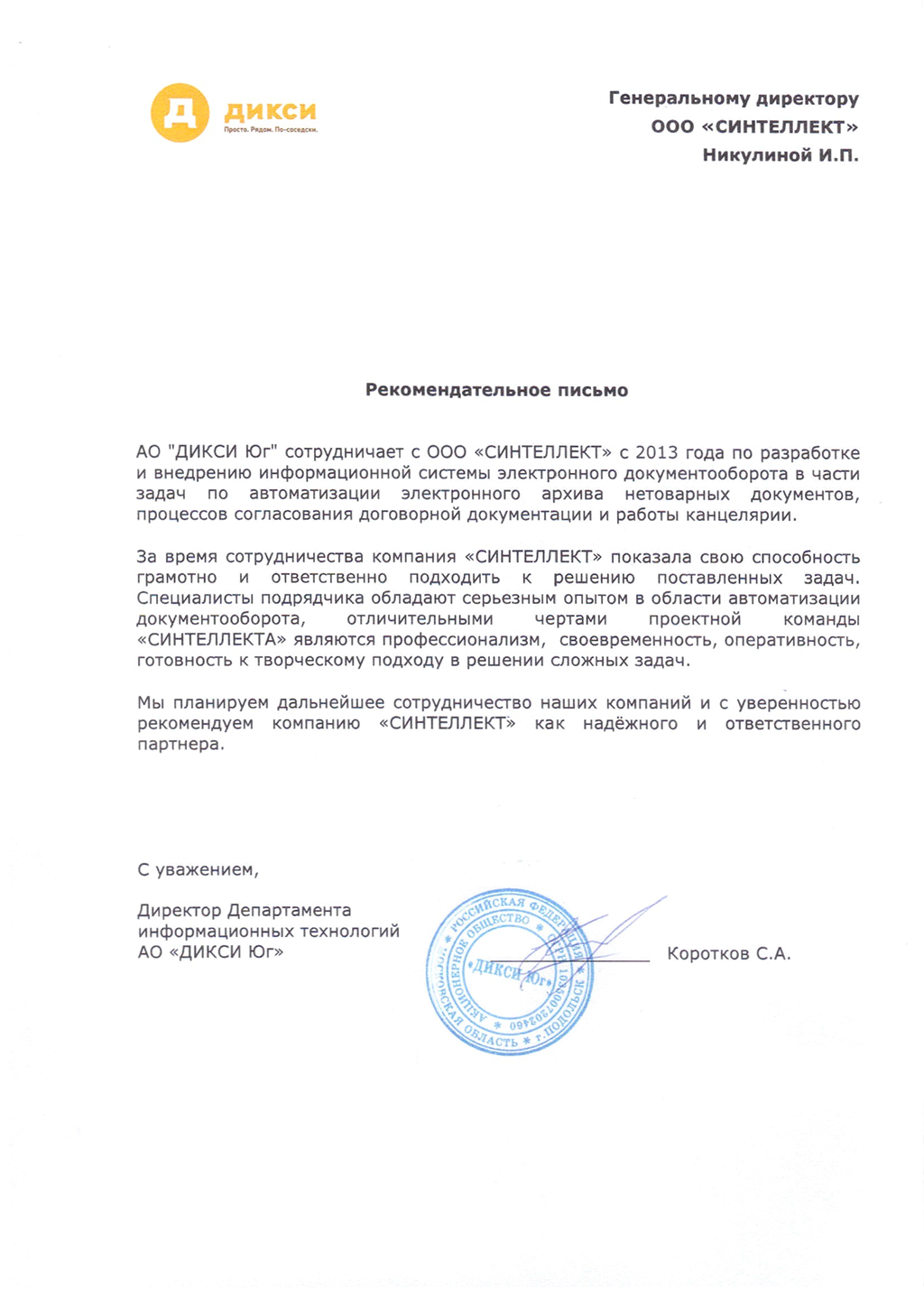 АО «ДИКСИ Юг» сотрудничает с ООО «СИНТЕЛЛЕКТ» с 2013 года по разработке и внедрению информационной системы электронного документооборота в части задач по автоматизации электронного архива нетоварных документов, процессов согласования договорной документации и работы канцелярии.