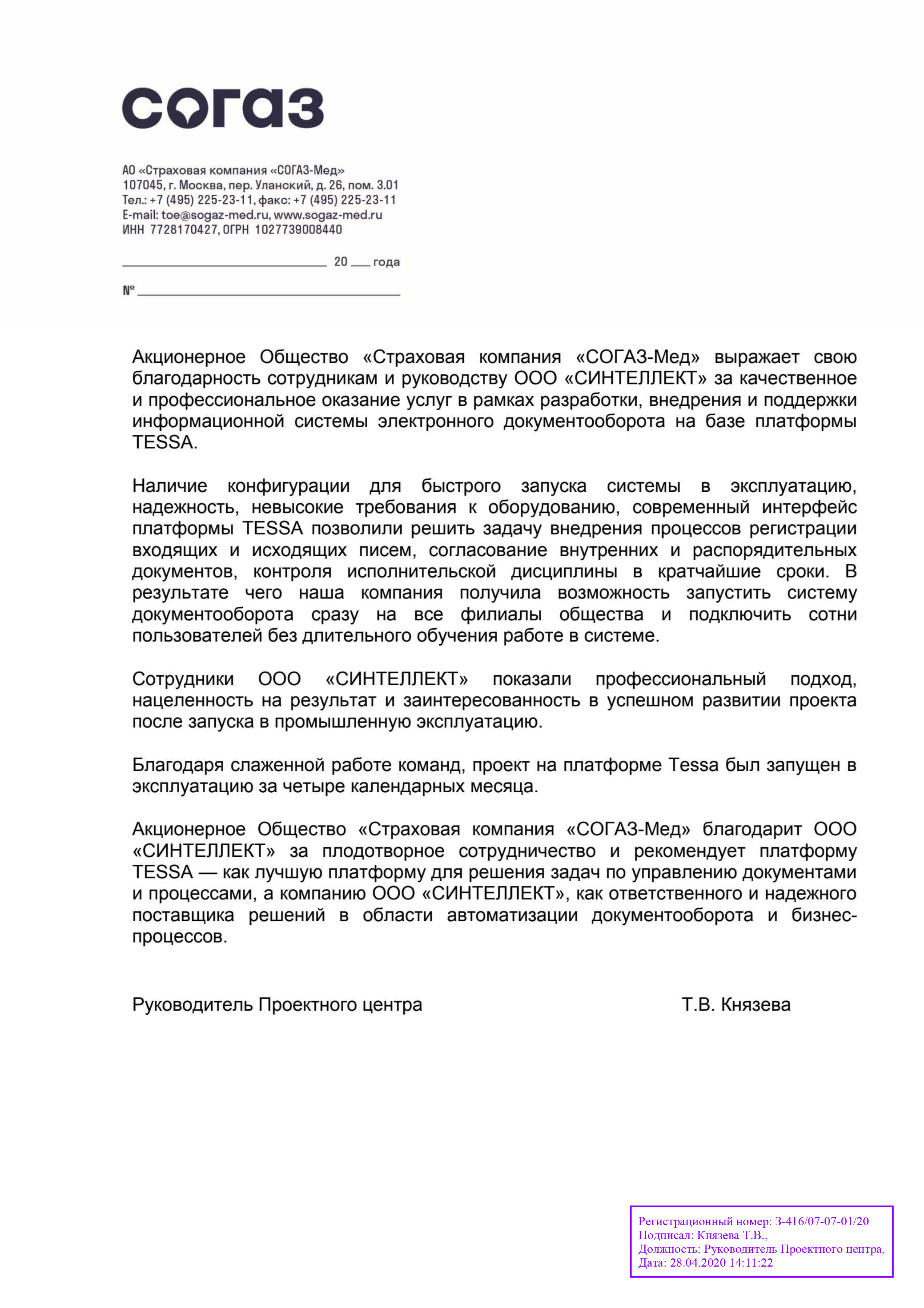 Акционерное Общество «Страховая компания «СОГАЗ-Мед» благодарит ООО «СИНТЕЛЛЕКТ» за плодотворное сотрудничество и рекомендует платформу TESSA - как лучшую платформу для решения задач по управлению документами и процессами, а компанию ООО «СИНТЕЛЛЕКТ», как ответственного и надежного поставщика решений в области автоматизации документооборота и бизнес-процессов.