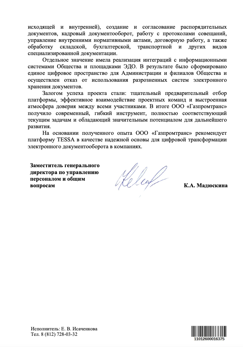На основании полученного опыта ООО «Газпромтранс» рекомендует платформу TESSA в качестве надежной основы для цифровой трансформации электронного документооборота в компаниях.